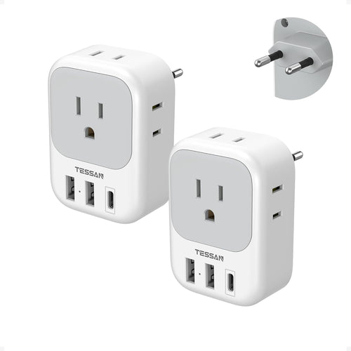 2 Pack European Plug Adapter USB C, TESSAN US to Europe Adapter 4 Outlets 3 USB Charger, Type C International Power Adaptor to Italy Spain France Portugal Iceland Germany, Europe Travel Essentials